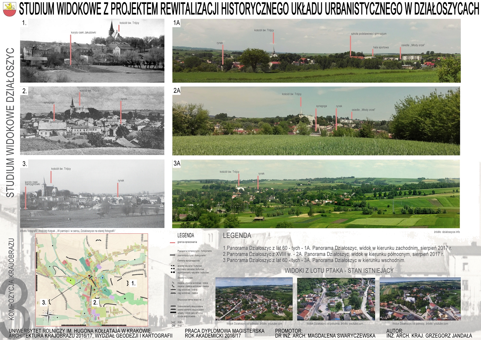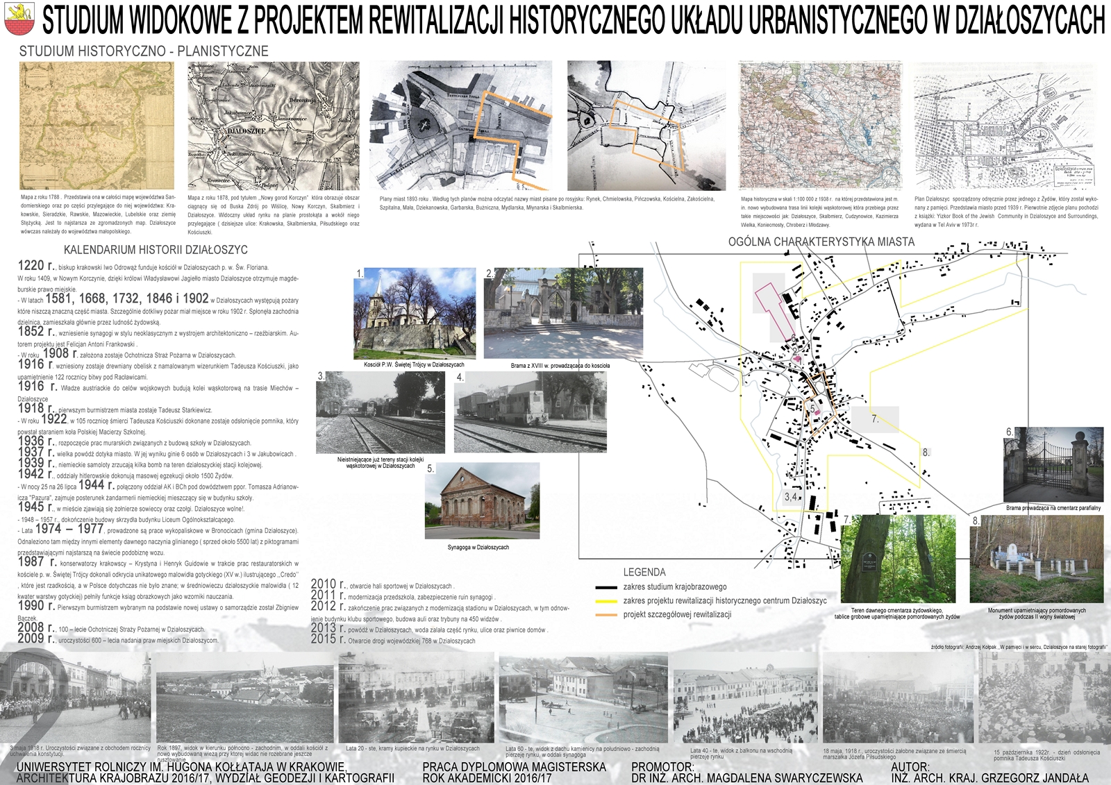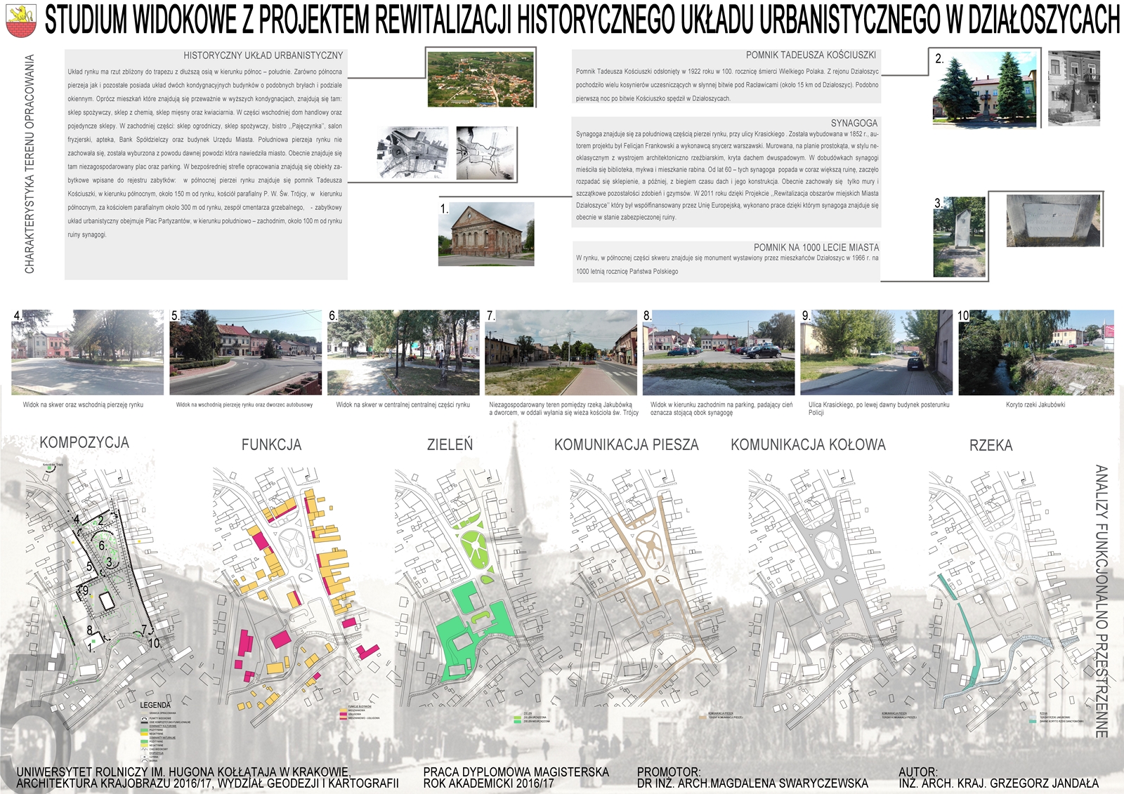 Ziel der Masterarbeit war die Analyse von Kulturlandschaftsveränderungen und die Untersuchung der äußeren und inneren funktionalen und räumlichen Beziehungen zwischen Działoszyce und der Umgebung im Hinblick auf die Richtung ihrer Revitalisierung. Das Hauptziel bestand darin, die Möglichkeit aufzuzeigen, den Nutzen und die ästhetischen Werte der Stadt auf der Grundlage ihrer historischen und landschaftlichen Ressourcen zu erhöhen, so dass sie für die Einwohner freundlich wird und eine touristische Attraktion der Region darstellt.