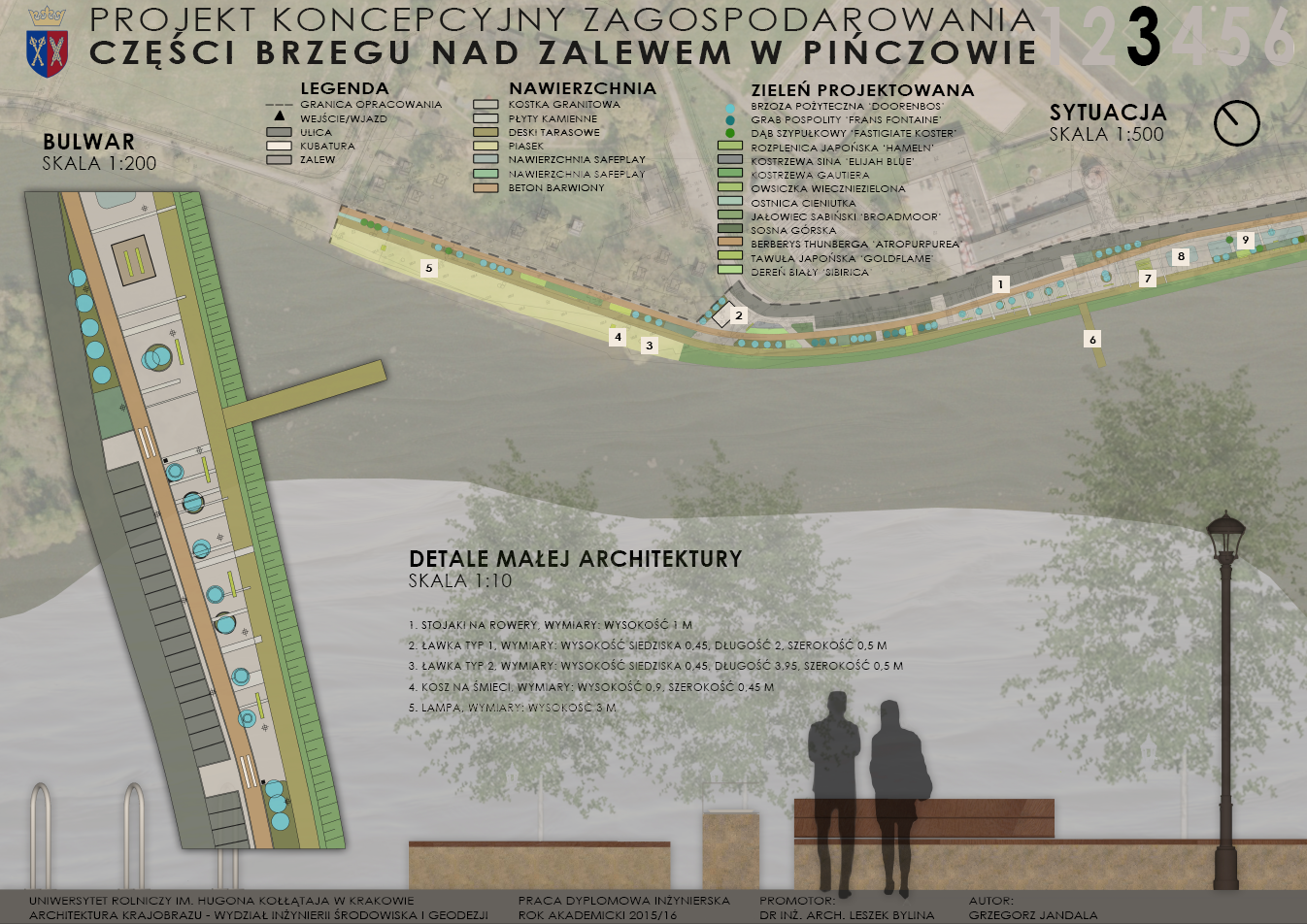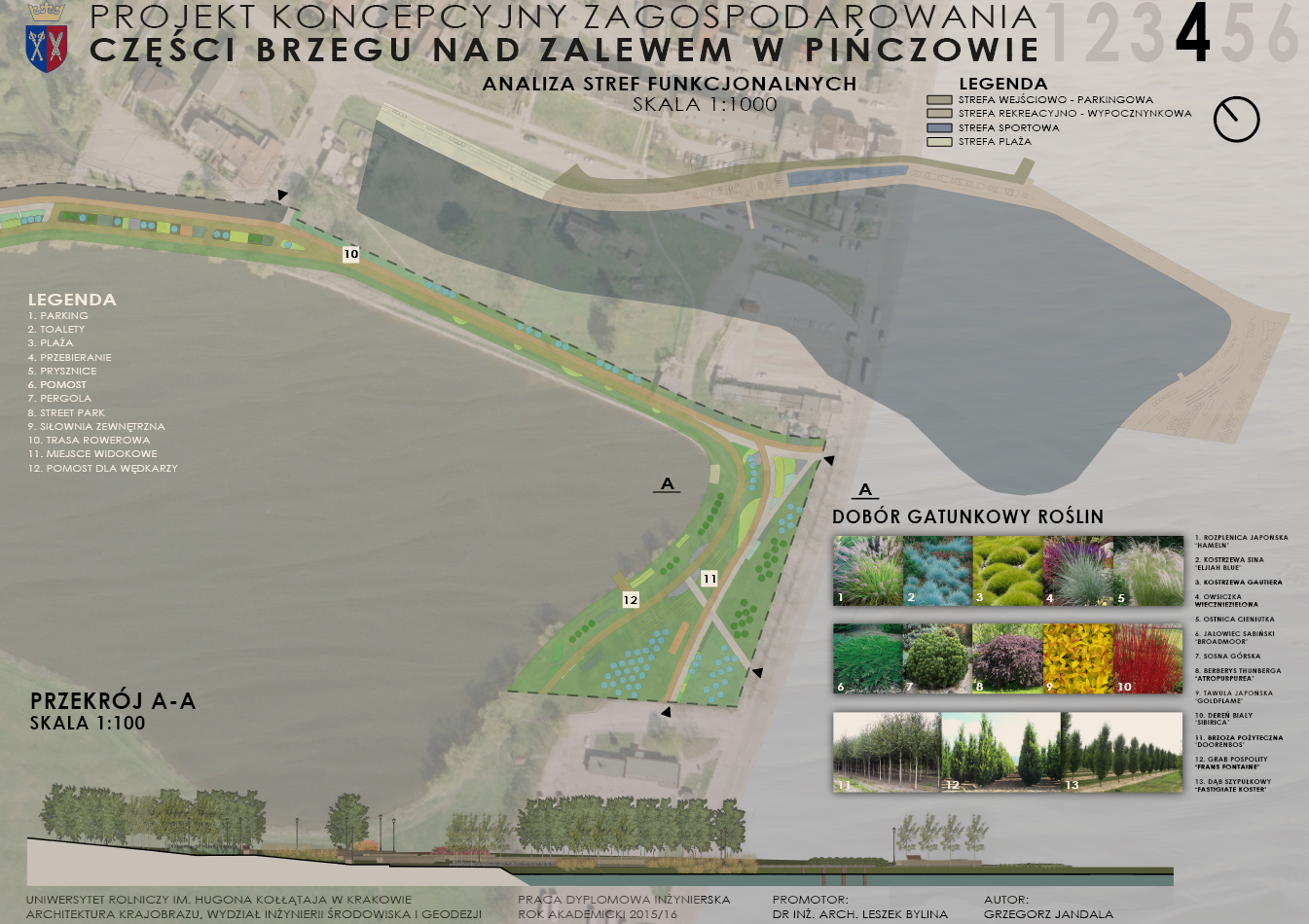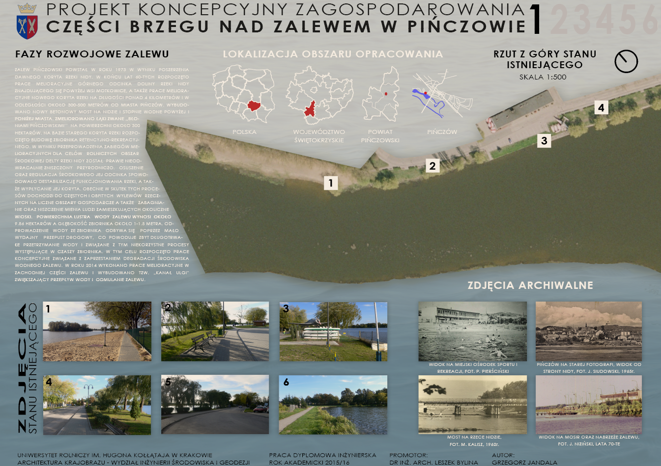 Zakres pracy obejmuje zagospodarowanie części terenu brzegu zalewu pińczowskiego, a w tym: informacje dotyczące zalewu, opis stanu istniejącego, analizy przestrzenno - funkcjonalne, dokumentację fotograficzną stanu istniejącego, inwentaryzację dendrologiczną, wytyczne projektowe, projekt rewitalizacji brzegu zalewu, schematy rozwiązań komunikacyjnych, schematy rozwiązań dotyczących małej architektury i zieleni oraz wizualizacje.