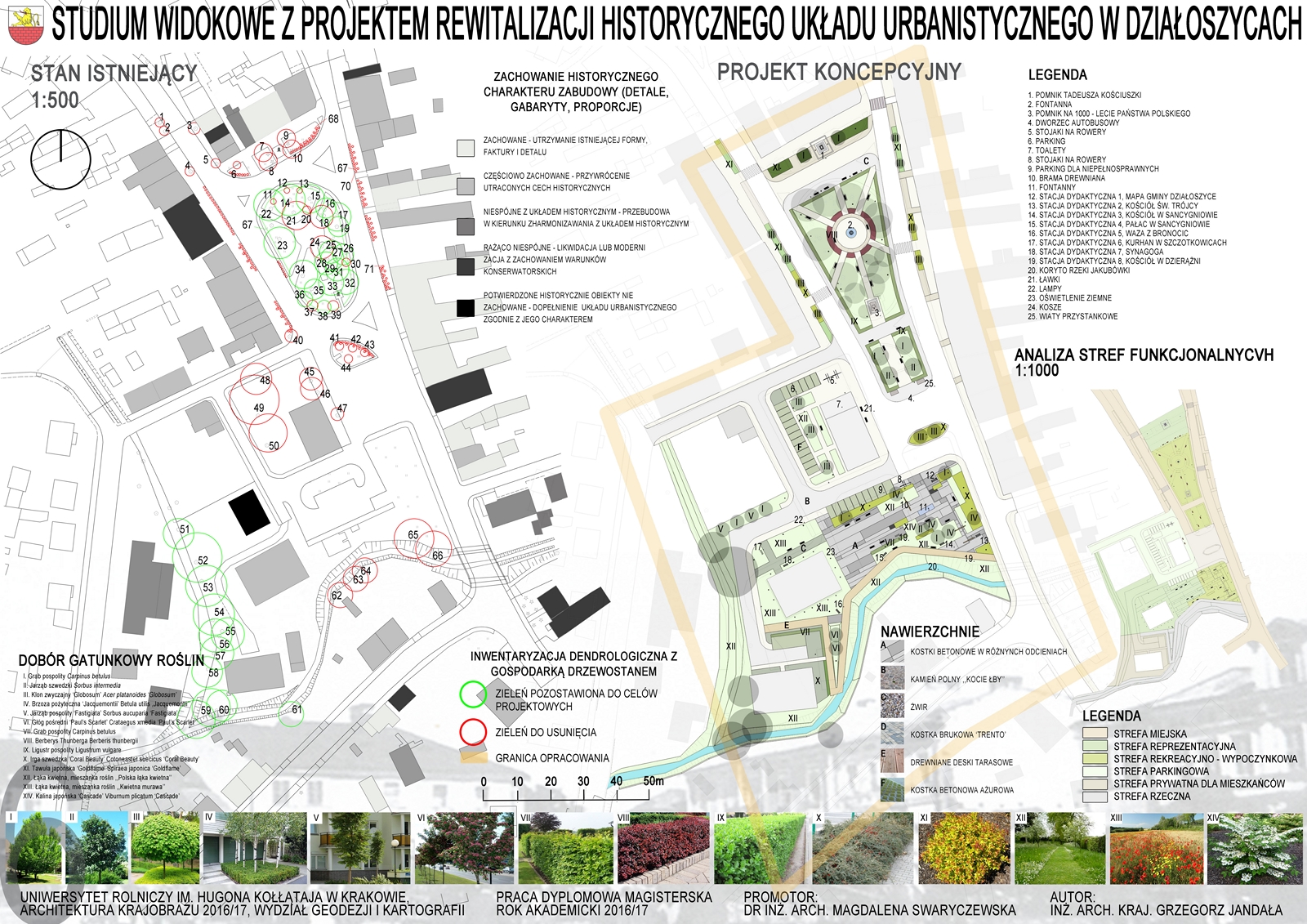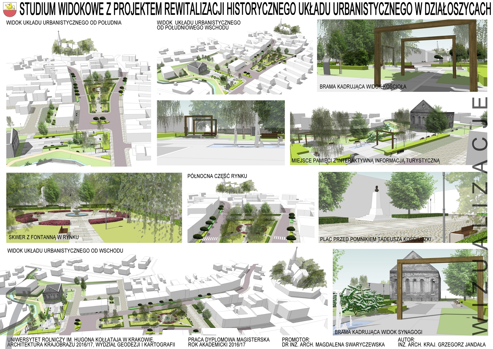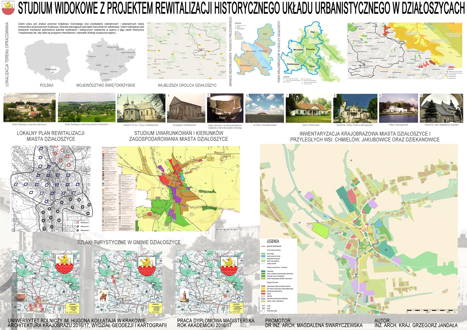 Celem pracy magisterskiej była analiza przemian krajobrazu kulturowego oraz przebadanie zewnętrznych i wewnętrznych relacji funkcjonalno-przestrzennych Działoszyc i terenów otaczających pod kątem kierunków ich rewitalizacji. Celem nadrzędnym było wskazanie możliwości podniesienia walorów użytkowych i estetycznych miasteczka w oparciu o jego zasób historyczny i krajobrazowy tak, aby stało się przyjazne mieszkańcom i stanowiło atrakcję turystyczną regionu.