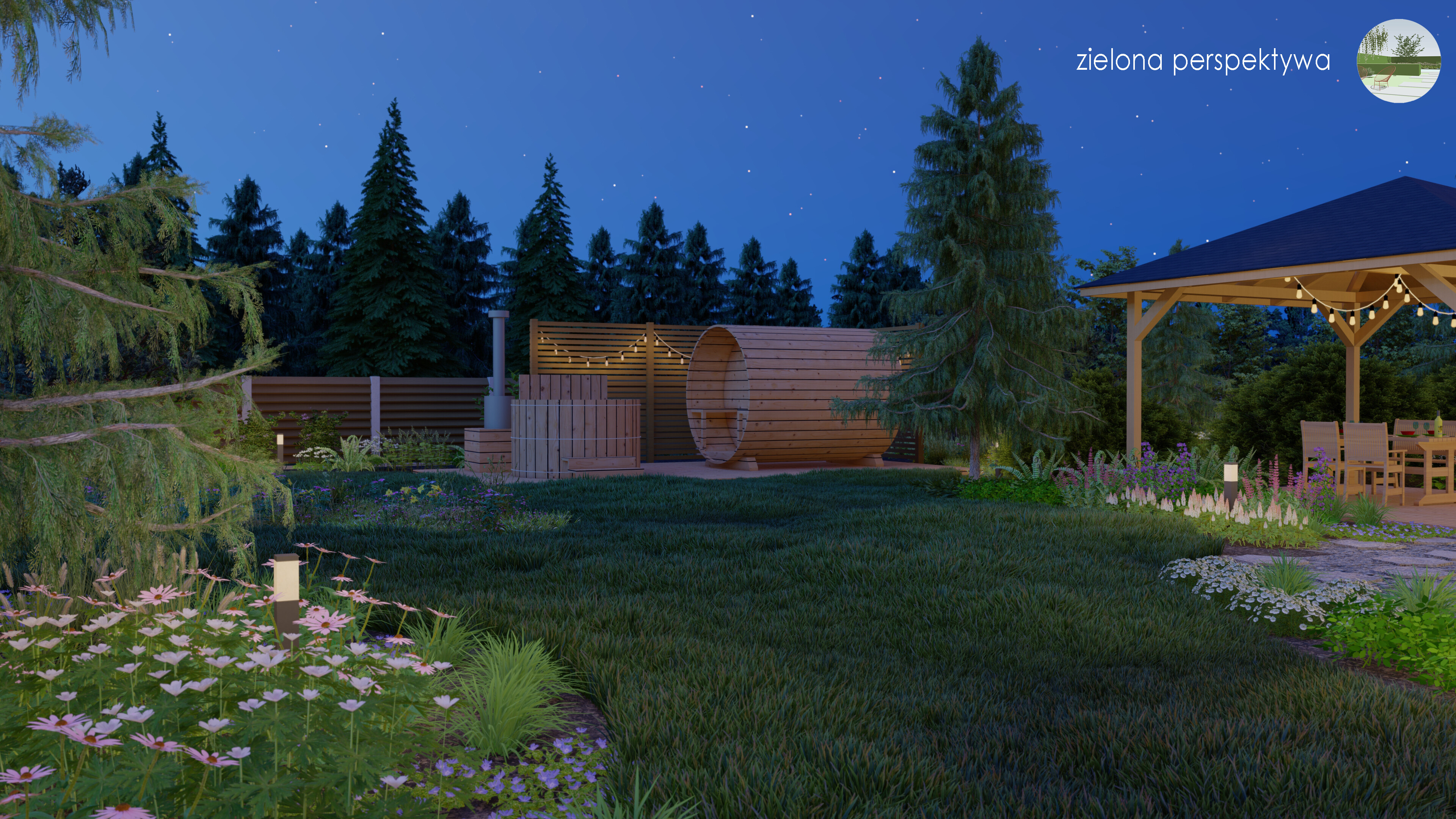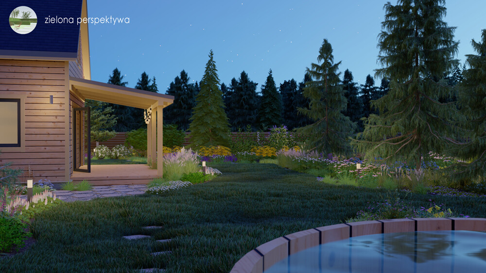 W środkowej, zachodniej części ogrodu zaprojektowałem miejsce na strefę relaksu, gdzie umieściłem saunę oraz gorącą beczkę. To miejsce ma na celu stworzenie oazy spokoju i relaksu, pozwalając cieszyć się korzyściami sauny oraz przyrodniczym otoczeniem lasu. Po przeciwnej stronie, wschodnim narożniku znajduje się warzywnik, zapewniający możliwość uprawy własnych warzyw w zgodzie z naturą. Altana, otoczona roślinnością, zapewni schronienie przed słońcem i deszczem, tworząc przyjemne miejsce do odpoczynku. Najważniejszym elementem jest widok na las. Praktycznie z każdego miejsca ogrodu można cieszyć się pięknem drzew, dźwiękami natury i zmieniającymi się kolorami lasu.